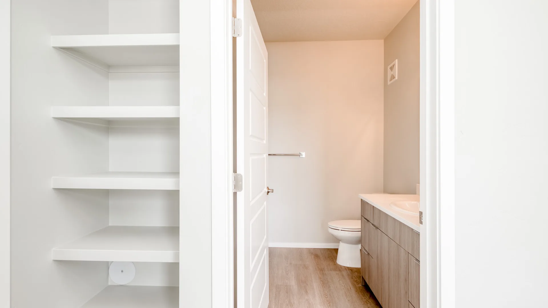 Additional shelving in each bathroom ensures plenty of storage space.