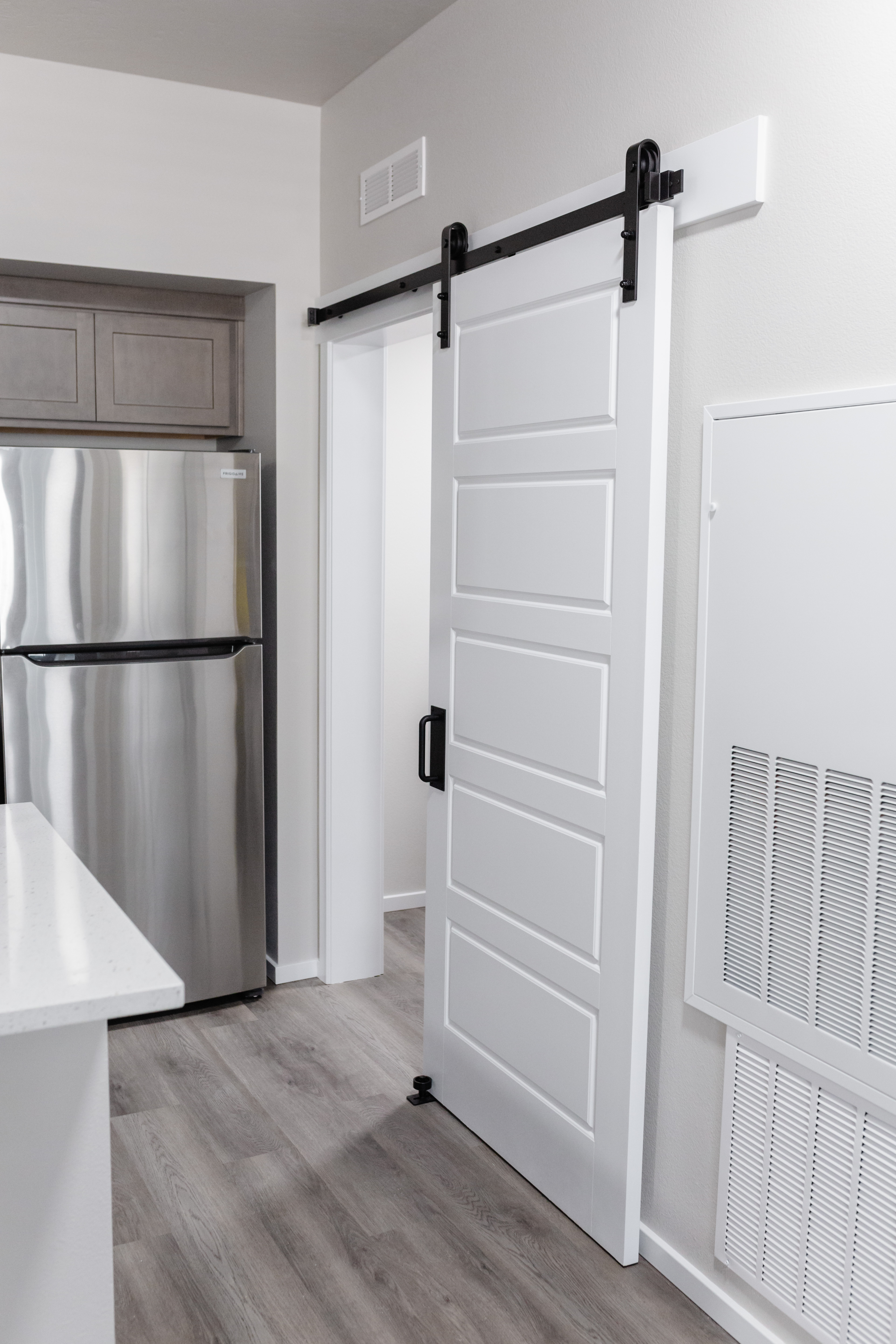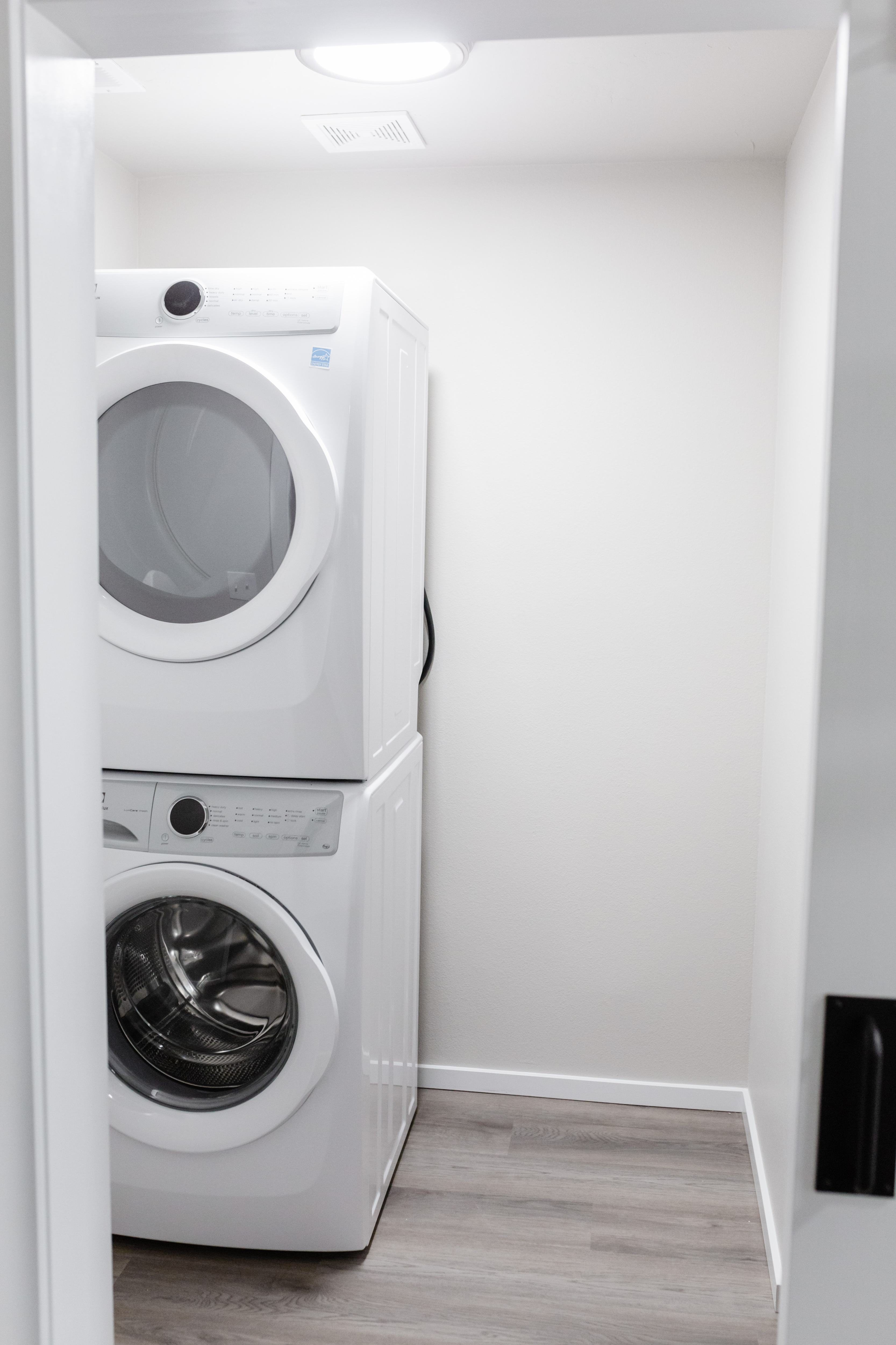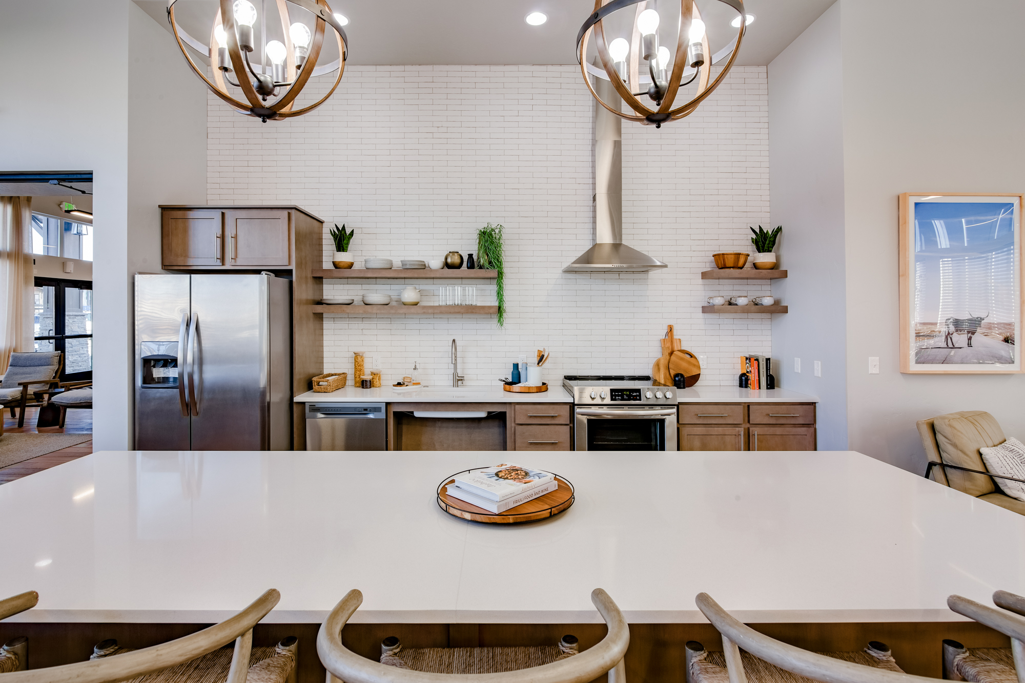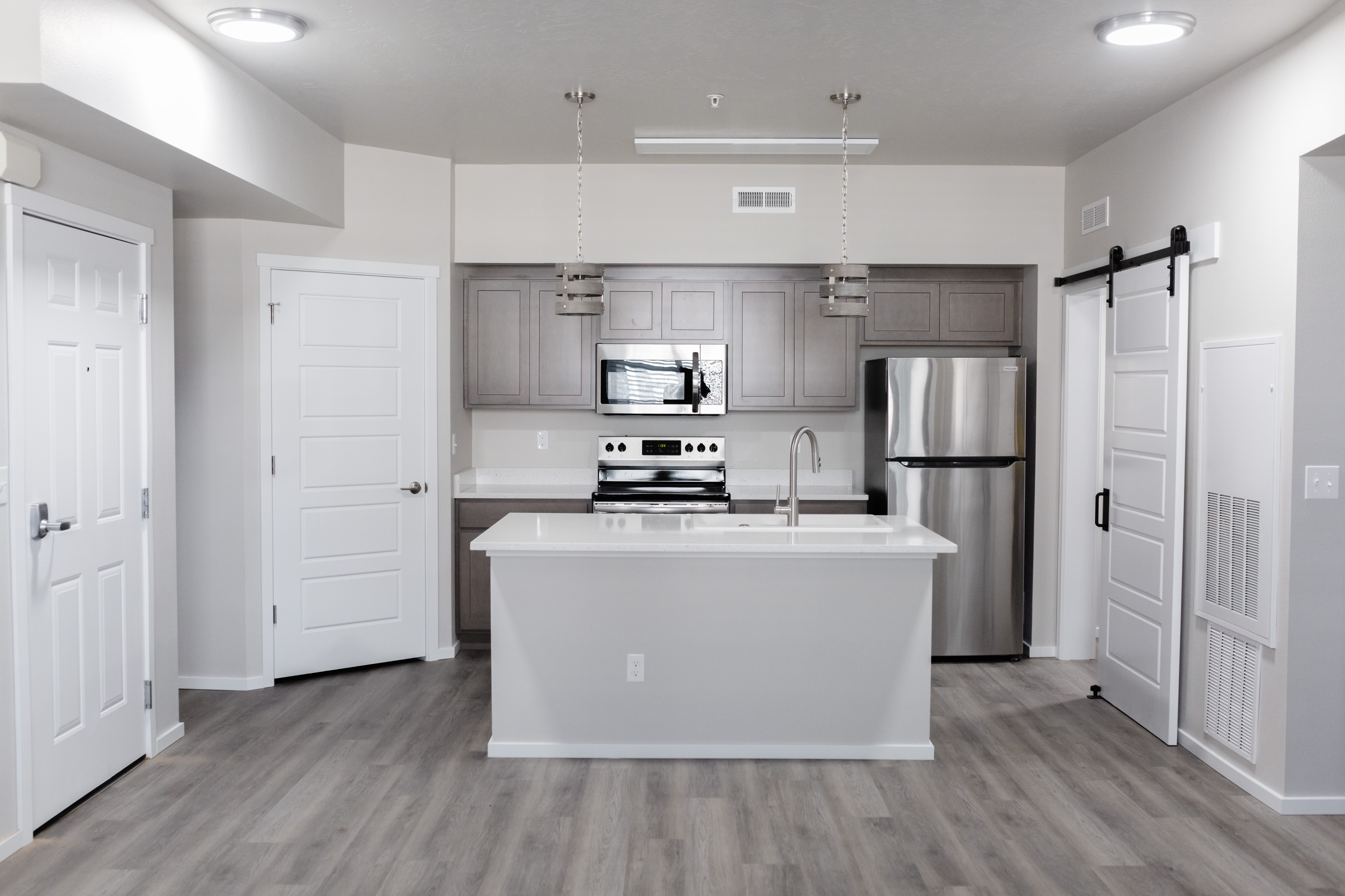 Enjoy a kitchen where you don’t have to compromise on style, space or storage. The kitchen has white quartz countertops, stainless steel appliances, plenty of cabinets and pantry space, plus a kitchen island with a double-sided sink.