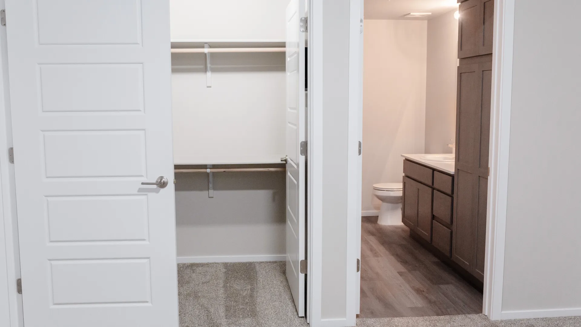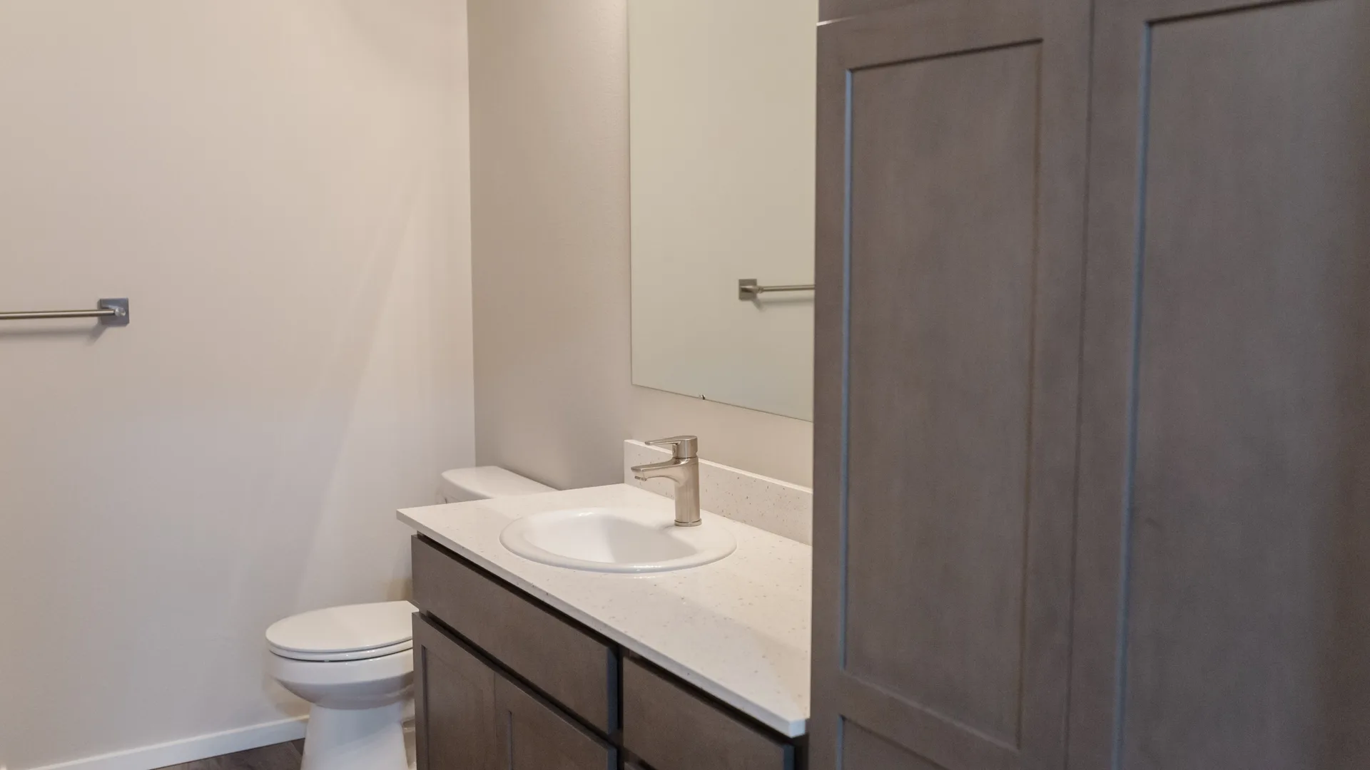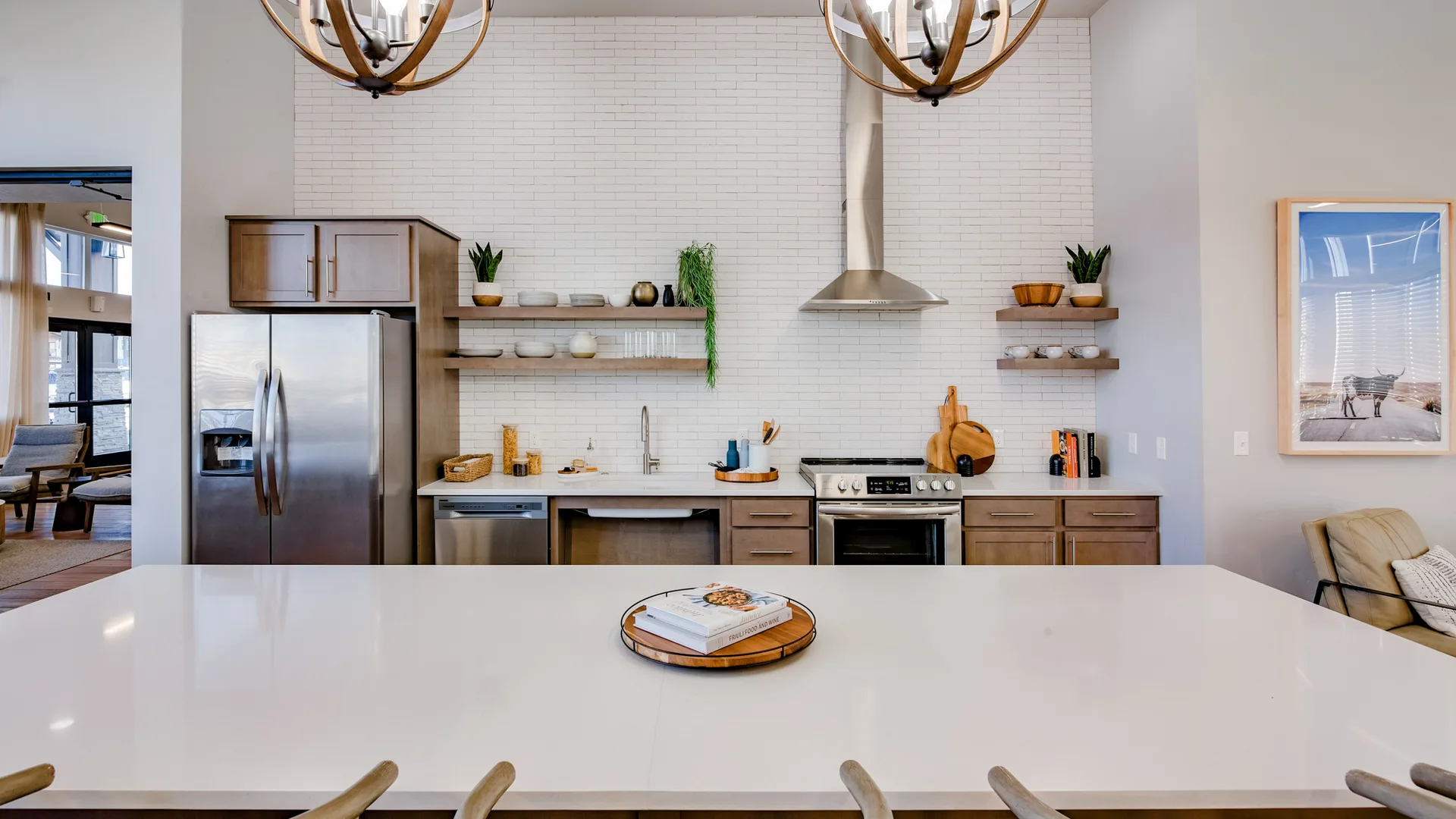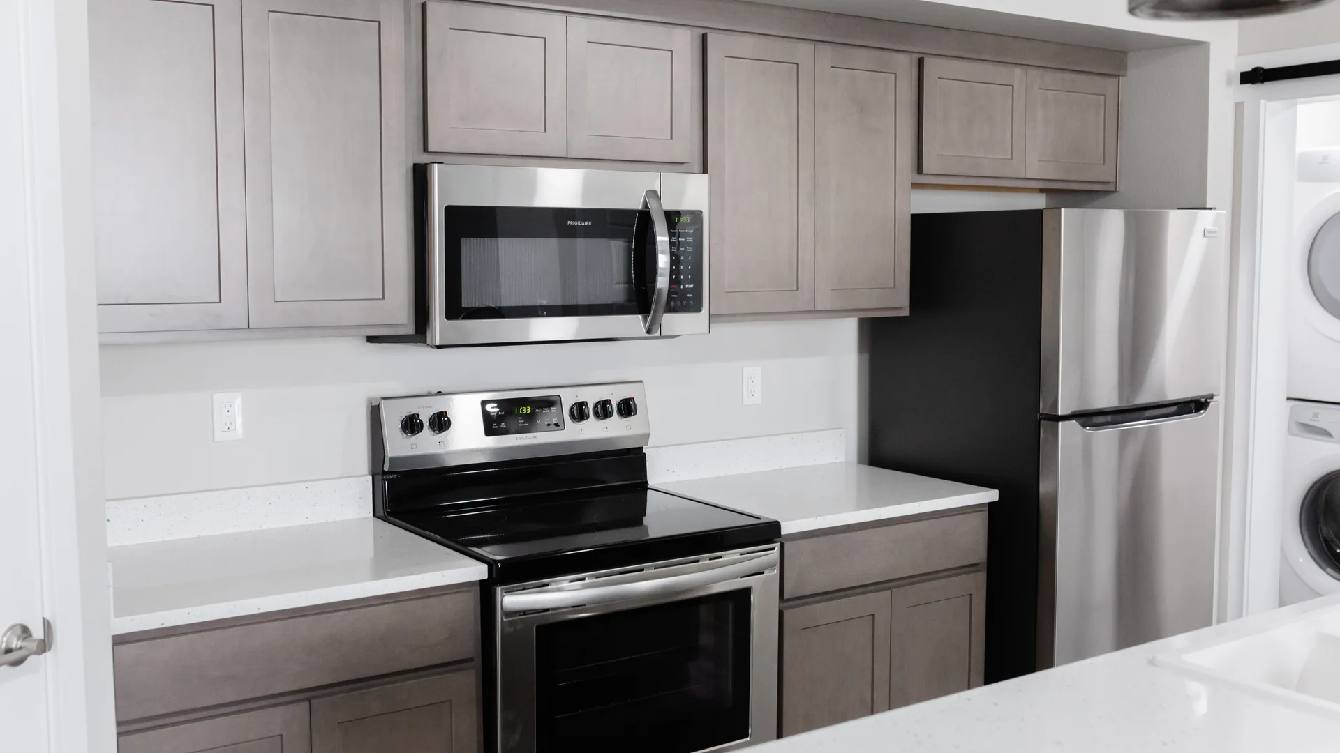 Enjoy a kitchen where you don’t have to compromise on style, space or storage. The kitchen has white quartz countertops, stainless steel appliances, plenty of cabinets and pantry space, plus a kitchen island with a double-sided sink.