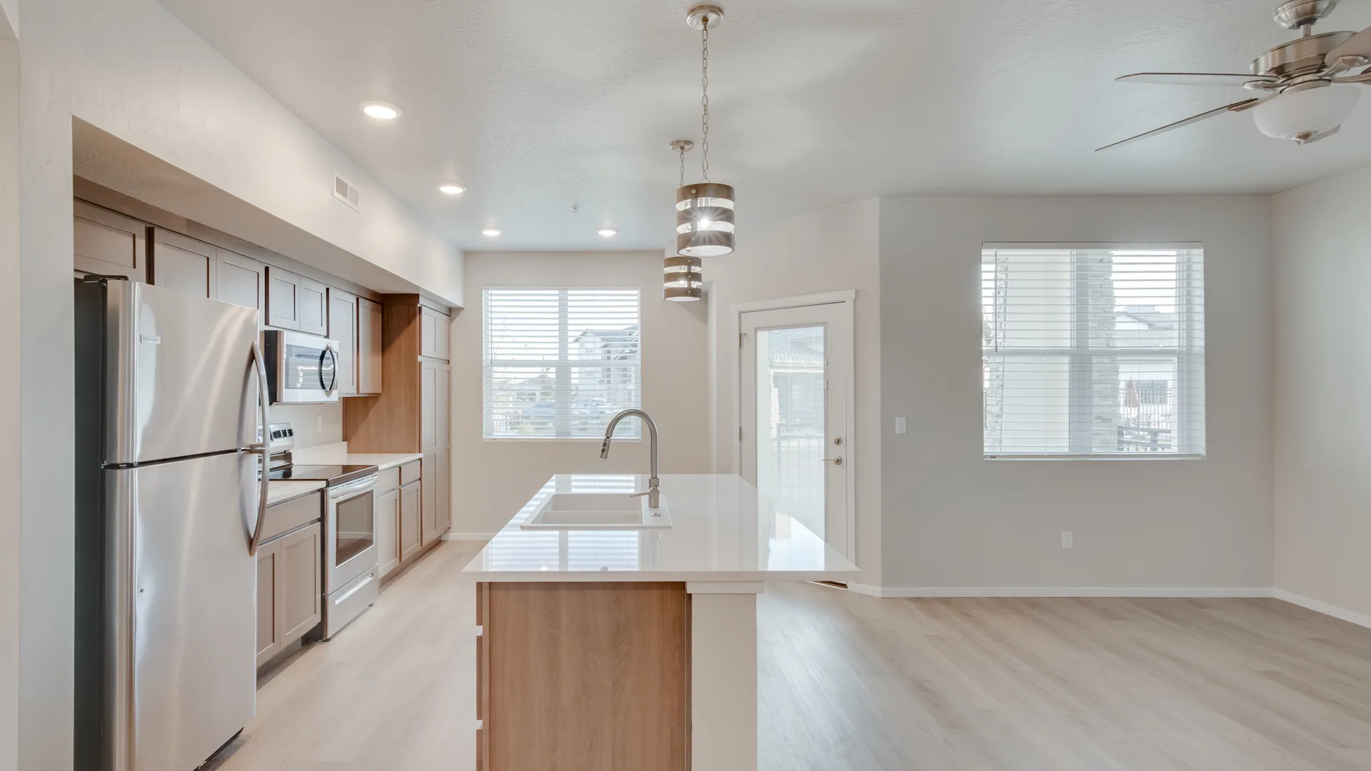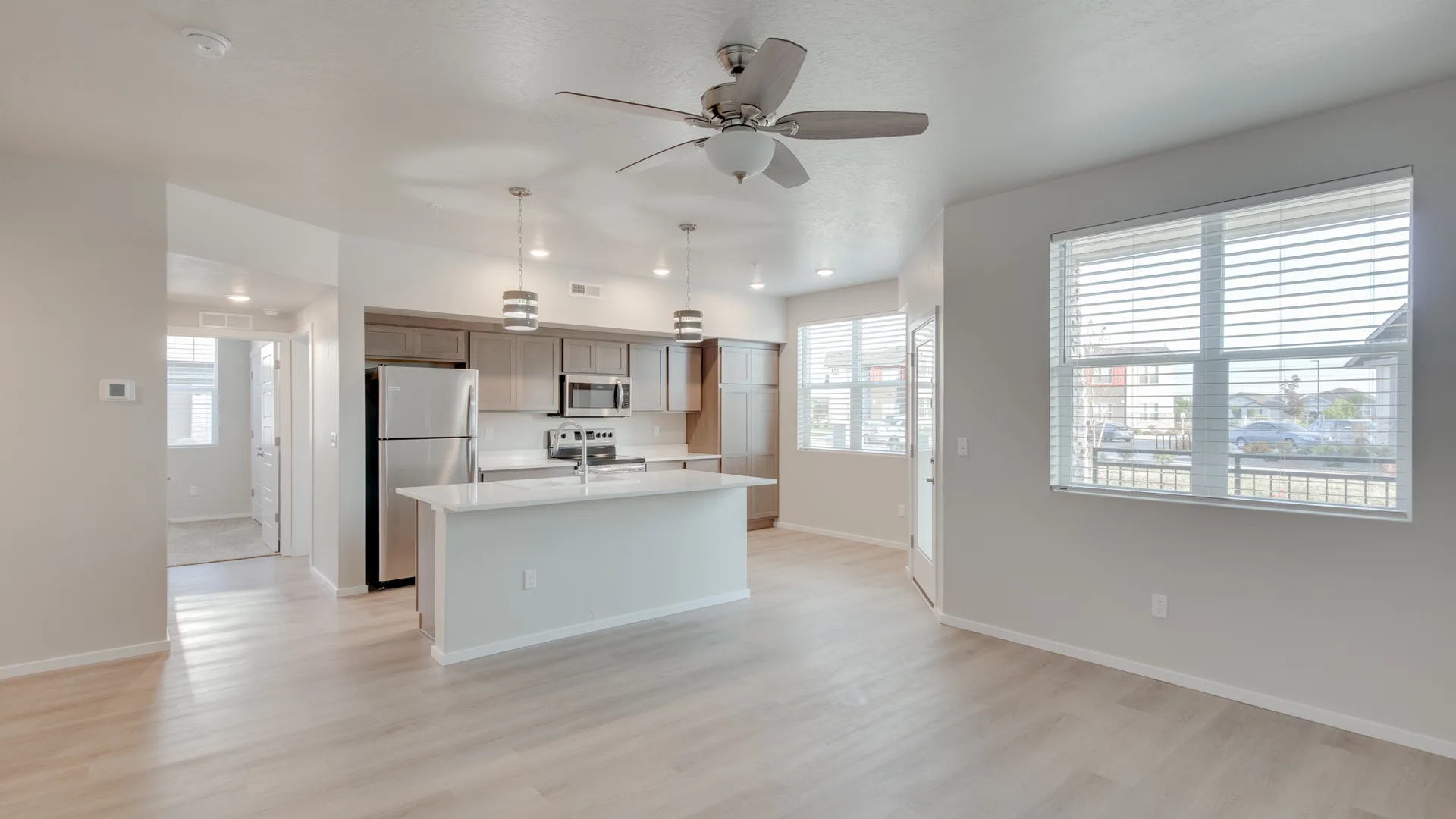 Colors are neutral and warm and welcoming. Carpet in the bedrooms, EVP in the living, kitchen, bathrooms and laundry area. Ceiling fan and top floor homes have vaulted ceilings.